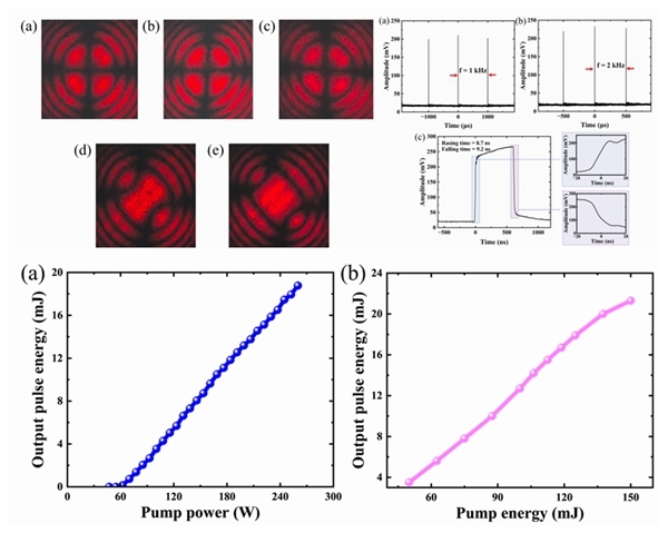 在核心部件突破的基础上,团队将电光开关成功应用于自主研发的Nd:YAG混合腔激光器系统,实现了两种泵浦模式下的高性能输出:在连续泵浦模式下,激光器稳定实现37.54 W输出功率、2 kHz重复频率及6.5 ns脉冲宽度;切换至脉冲泵浦模式后,激光器成功输出21.3 mJ单脉冲能量,重复频率达100 Hz,脉冲宽度为7.77 ns。两种泵浦模式下的激光输出均展现出近衍射极限的光束质量,标志着该激光器系统在核心指标上达到行业领先水平。