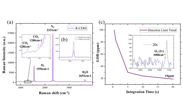 为了进一步挖掘探测潜力,团队在光路末端引入了一个回溯反射器,构建了“双周期”光路。激光在腔内完成第一圈反射后,被原路反射后进行第二圈传输,有效光程直接翻倍。该设计不仅利用了前向散射信号,还“回收”了通常被浪费的后向散射信号。实验表明,相比单周期模式,双周期设计的拉曼信号强度提升了约2.3倍,信噪比(SNR)提升了约2倍。