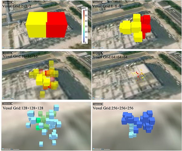 针对大尺度空间气体泄漏场景,团队利用单台红外远程遥测系统即可完成气体空间定位和分布重建。传统气体羽流的空间定位和分布重建方法都需要来自多台仪器或多角度的测量数据,增加了部署成本,实际部署过程复杂。此外,红外远程遥测系统的分辨率和计算机存储容量限制了气体羽流重建的空间分辨率。为了破解上述问题,团队依托自主研发的ZK-FTIR-GS1000型气体遥感成像仪,提出了一种基于深度学习的三维气体羽流重建生成网络。该网络采用八叉树表示来模拟气体羽流的稀疏三维分布特征,能够从粗到细地输出气云三维结构,且仅需要较小的计算和内存资源支撑。现场实验证实,该方法可以确定泄漏气体羽流的空间位置及分布范围,适配大尺度场景应用需求。