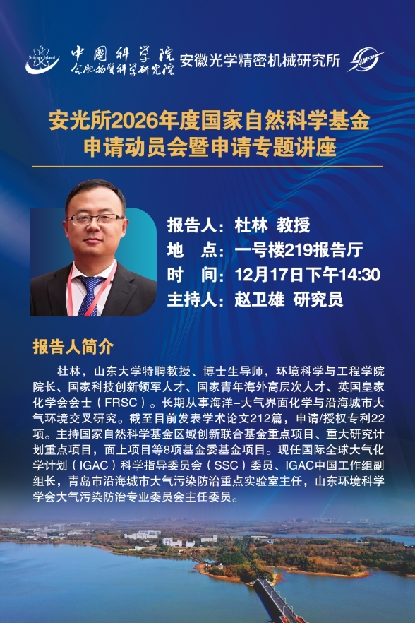 为做好2026年度国家自然科学基金项目申报工作,进一步提高国家自然科学基金项目的申报质量,安光所拟于2025年12月17日(周三)组织召开“2026年度国家自然科学基金申请动员会暨申请专题讲座”。